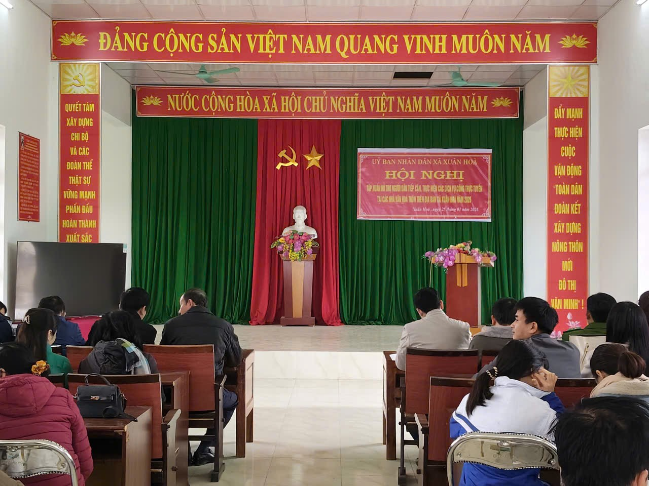 Thực hiện Kế hoạch số 12/KH-UBND ngày 16/01/2026 của UBND xã Xuân Hòa về tập huấn hỗ trợ người dân tiếp cận và sử dụng các dịch vụ công trực tuyến, sáng ngày 25/01/2026, tại Nhà văn hoá thôn Trung Thành,UBND xã đã tổ chức Hội nghị tập huấn dành cho người dân trên địa bàn tiếp cận và thực hiện các dịch vụ công trực tuyến.