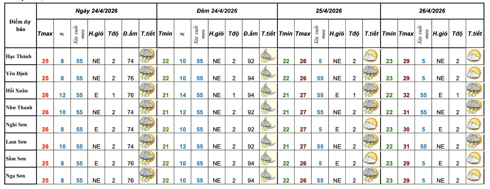 Do vậy, từ ngày 24 - 29/4, khu vực Thanh Hóa mây thay đổi đến nhiều mây, ngày trời nắng, chiều tối và đêm có mưa rào và dông, gió Đông bắc đến Đông cấp 2 - 3.