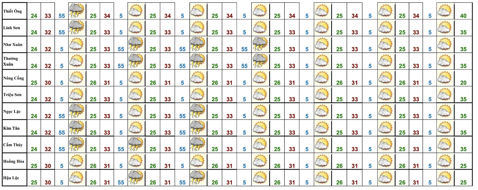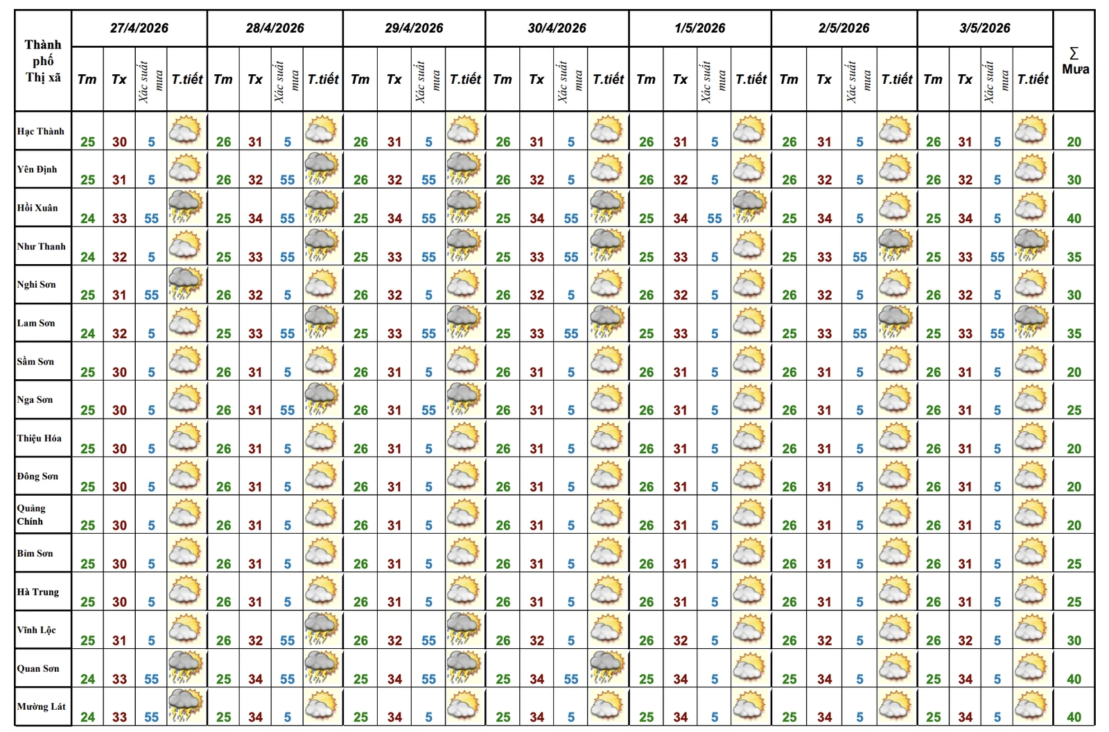 Thời tiết các điểm trên địa bàn tỉnh từ 24/4 đến 3/5: