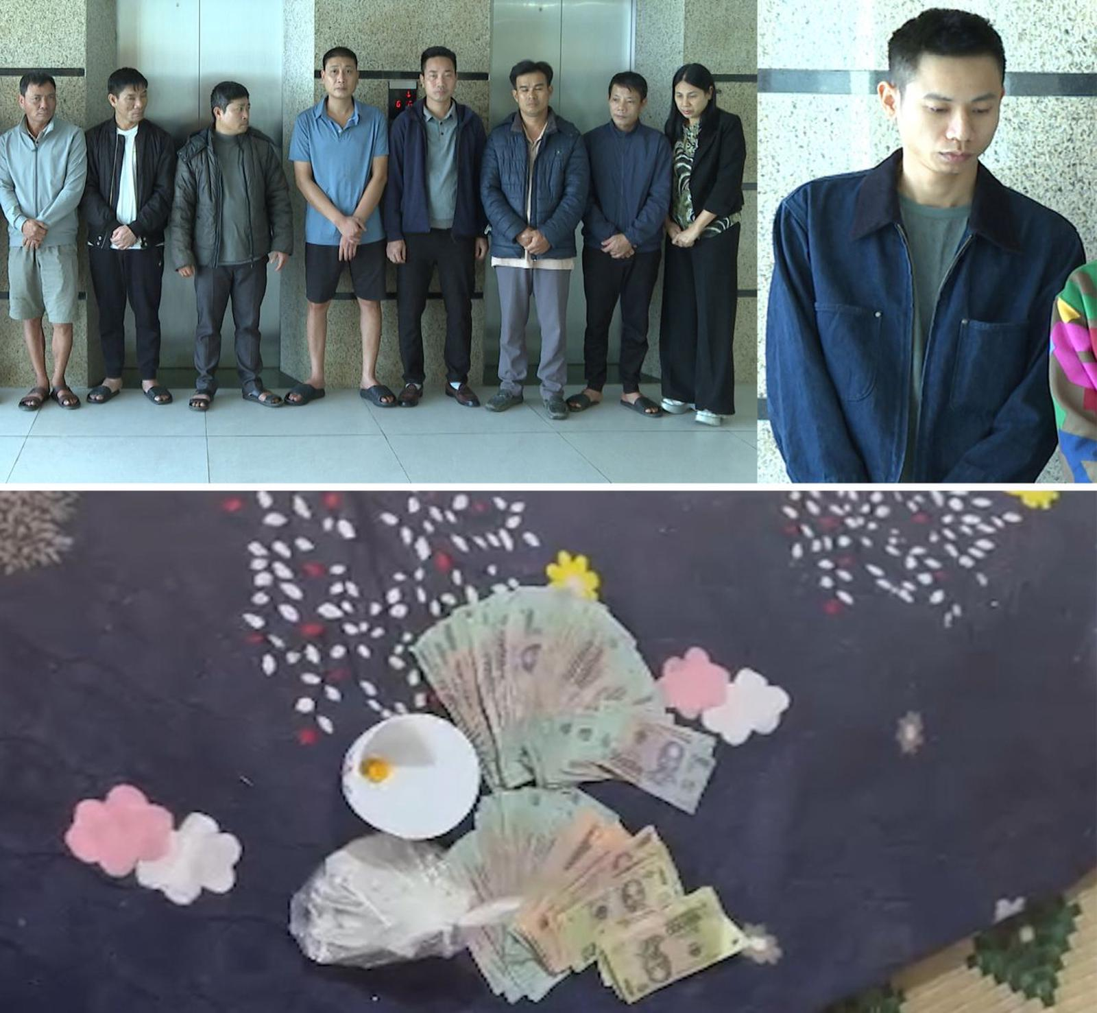 ác đối tượng đánh bạc, tổ chức đánh bạc cùng tang vật vụ án. Ảnh: Công an Thanh Hoá