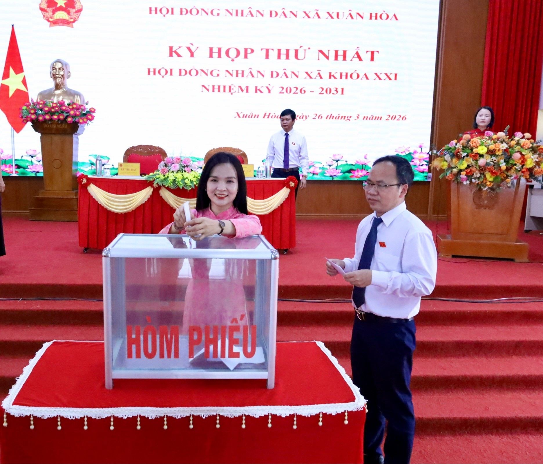 Sáng ngày 26/3/2026, tại Trung tâm Hội nghị Cơ quan Đảng ủy xã, Hội đồng nhân dân xã Xuân Hòa đã tổ chức Kỳ họp thứ nhất HĐND xã khóa XXI, nhiệm kỳ 2026 – 2031. Các đồng chí: Phạm Văn Luận, Bí Thư Đảng ủy, Chủ tịch HĐND xã khóa XX; Lê Thị Bảy, Ủy viên Ban Thường vụ Đảng Ủy, Phó Chủ tịch HĐND xã khóa XX đồng chủ tọa kỳ họp.