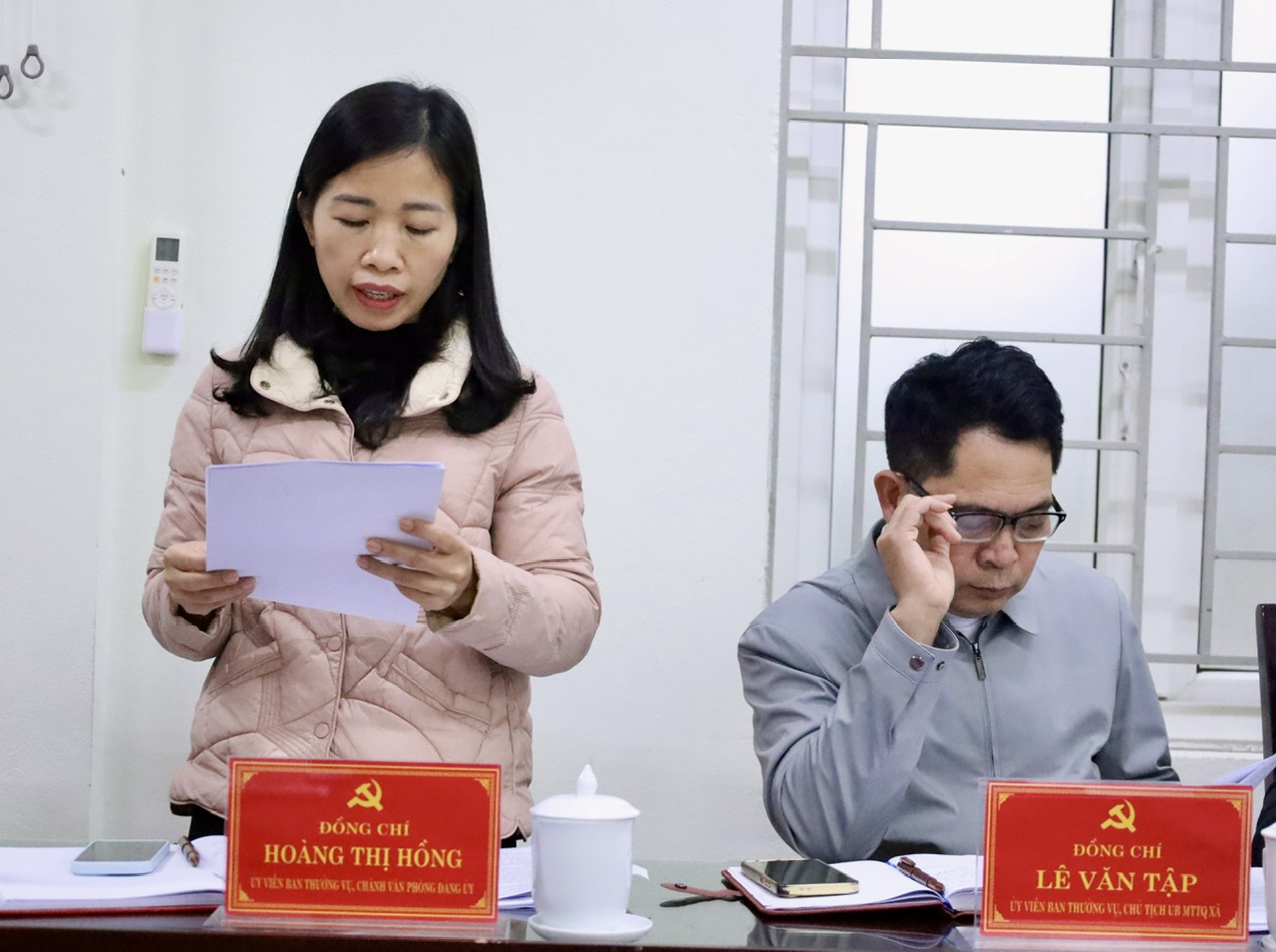 Đồng chí Lê Thị Lan, Uỷ viên Ban Thường vụ Đảng uỷ, Trưởng Ban Xây dựng Đảng thông qua các Tờ trình: Tờ trình về việc đề nghị cho chủ trương biệt phái viên chức Trung tâm dịch vụ nông nghiệp đến thực hiện nhiệm vụ tại Phòng Kinh tế; Tờ trình về việc cho ý kiến để Chủ tịch UBND xã thực hiện các thủ tục cho viên chức lãnh đạo, quản lý nghỉ hưu theo quy định.